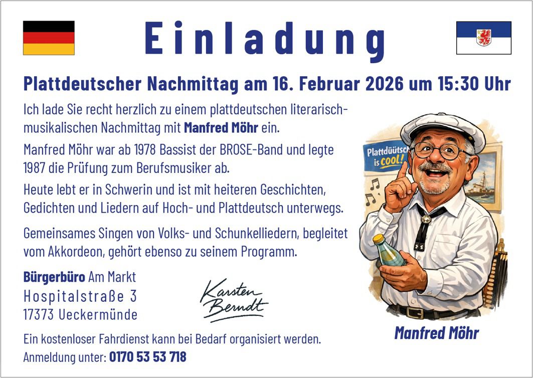 Ich lade herzlich zu einem plattdeutschen literarisch-musikalischen Nachmittag mit Manfred Möhr ein. Es entstehen für Sie keine Kosten. Ich freue mich auf Ihr Erscheinen und auf einen schönen Nachmittag in meinem Bürgerbüro.